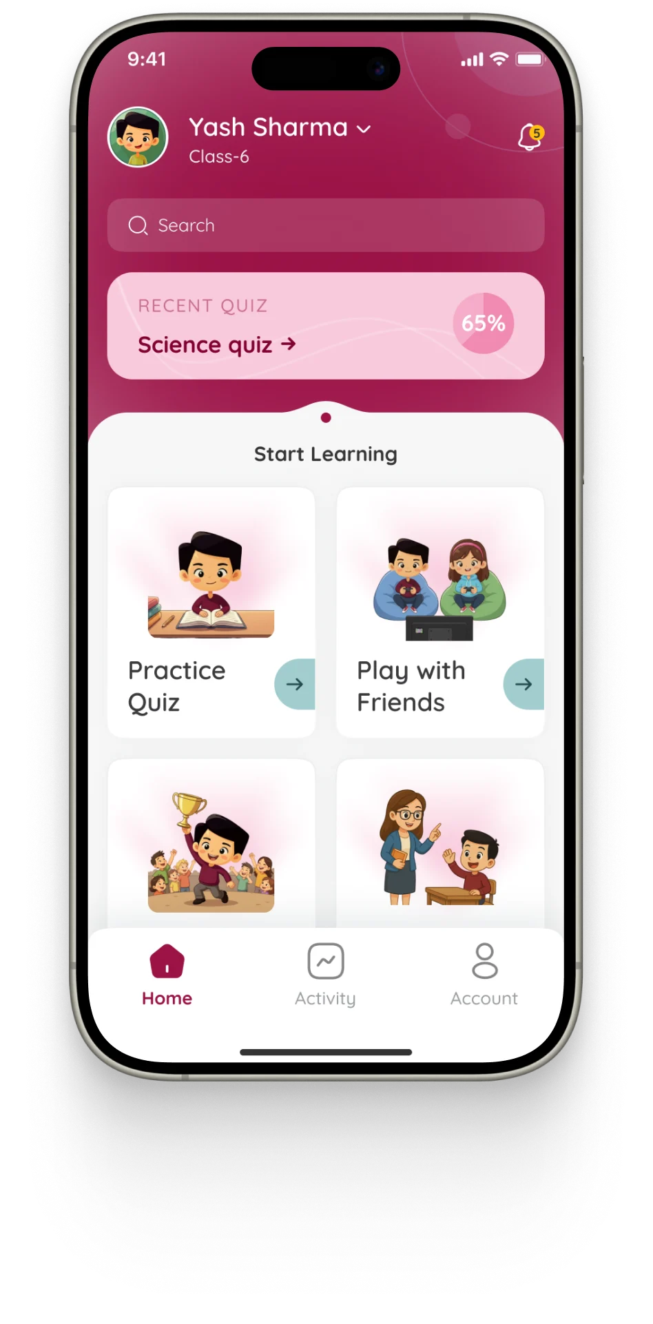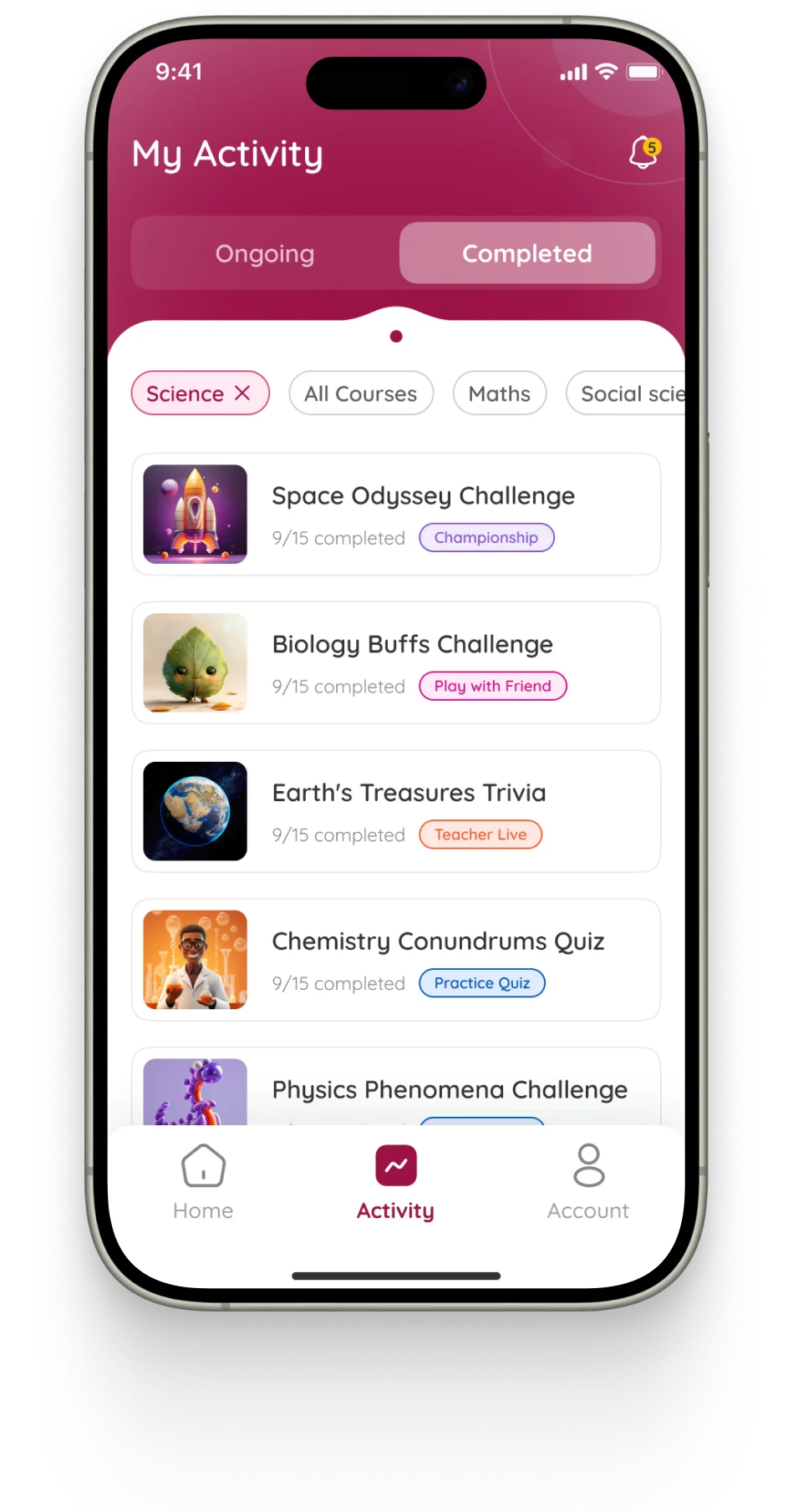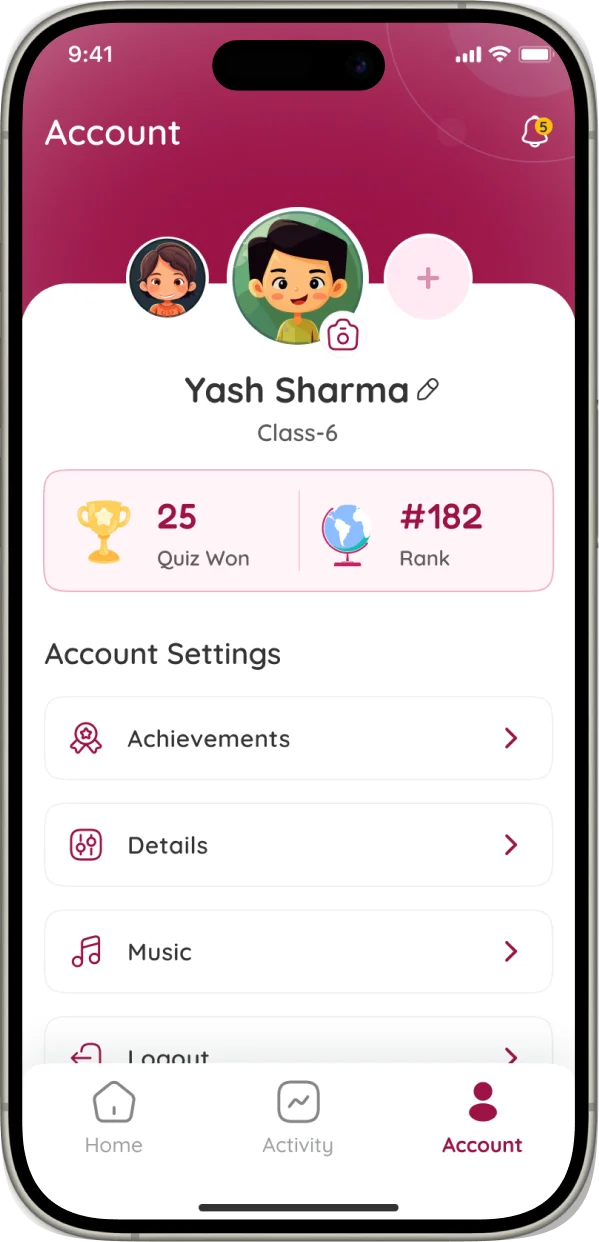 Activity tab enable both kids and parents to track learning journeys at a glance, supporting a holistic educational experience.