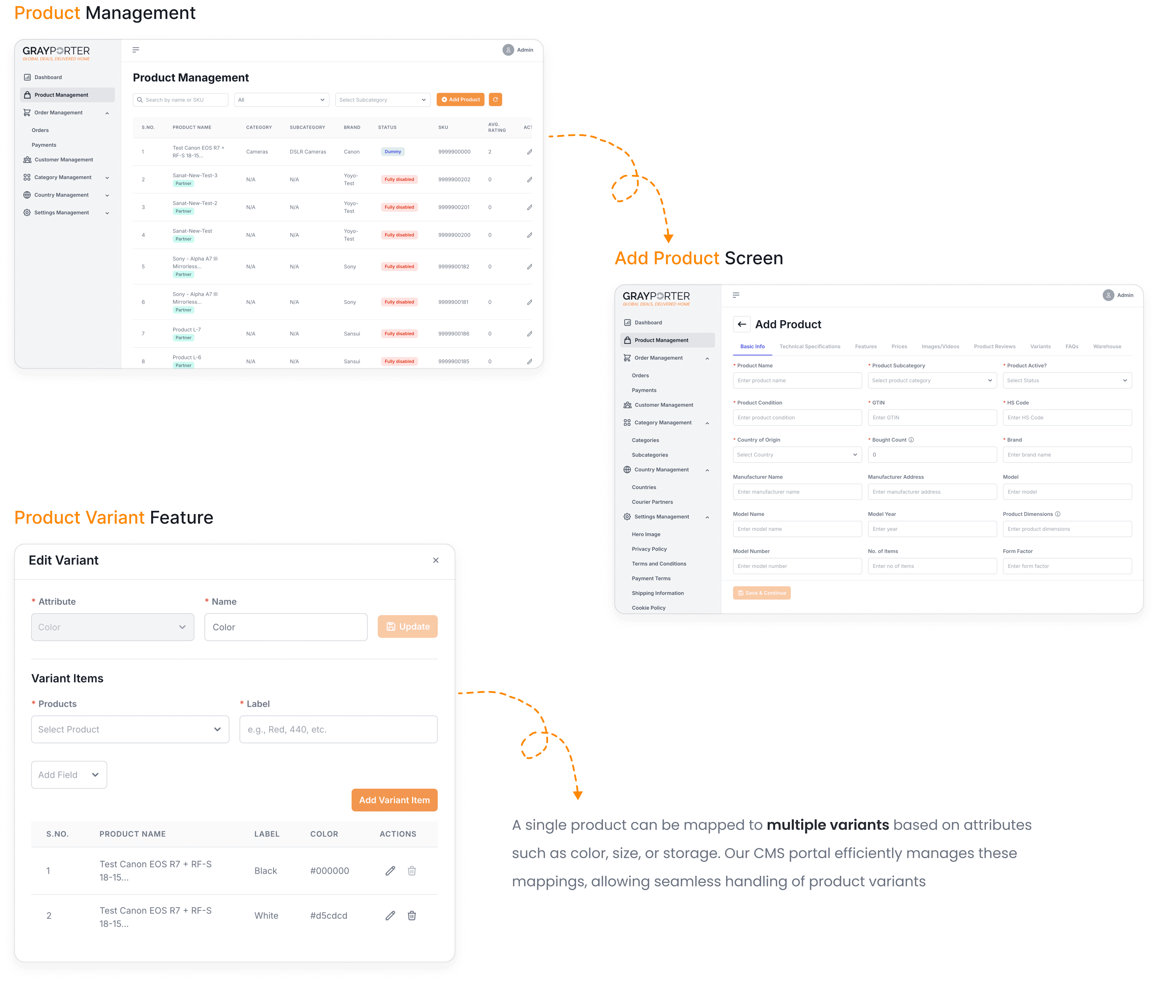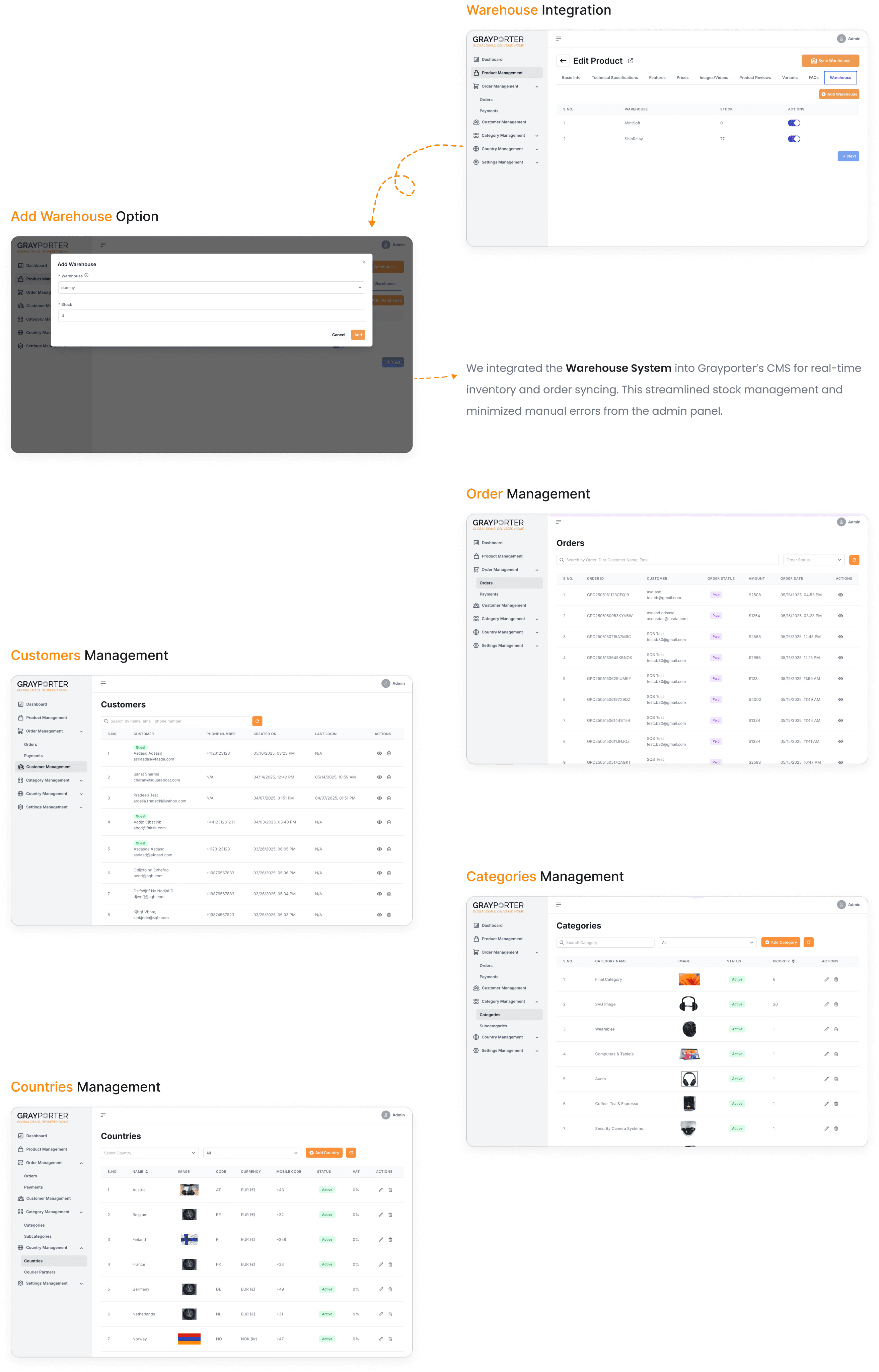 The Admin Panel flow includes dedicated screens for Product, Order, and Customer management. Admins can add new products with detailed fields and edit existing listings. Category and Country Management options allow easy organization and regional customization. The interface supports efficient modifications, ensuring smooth backend operations.