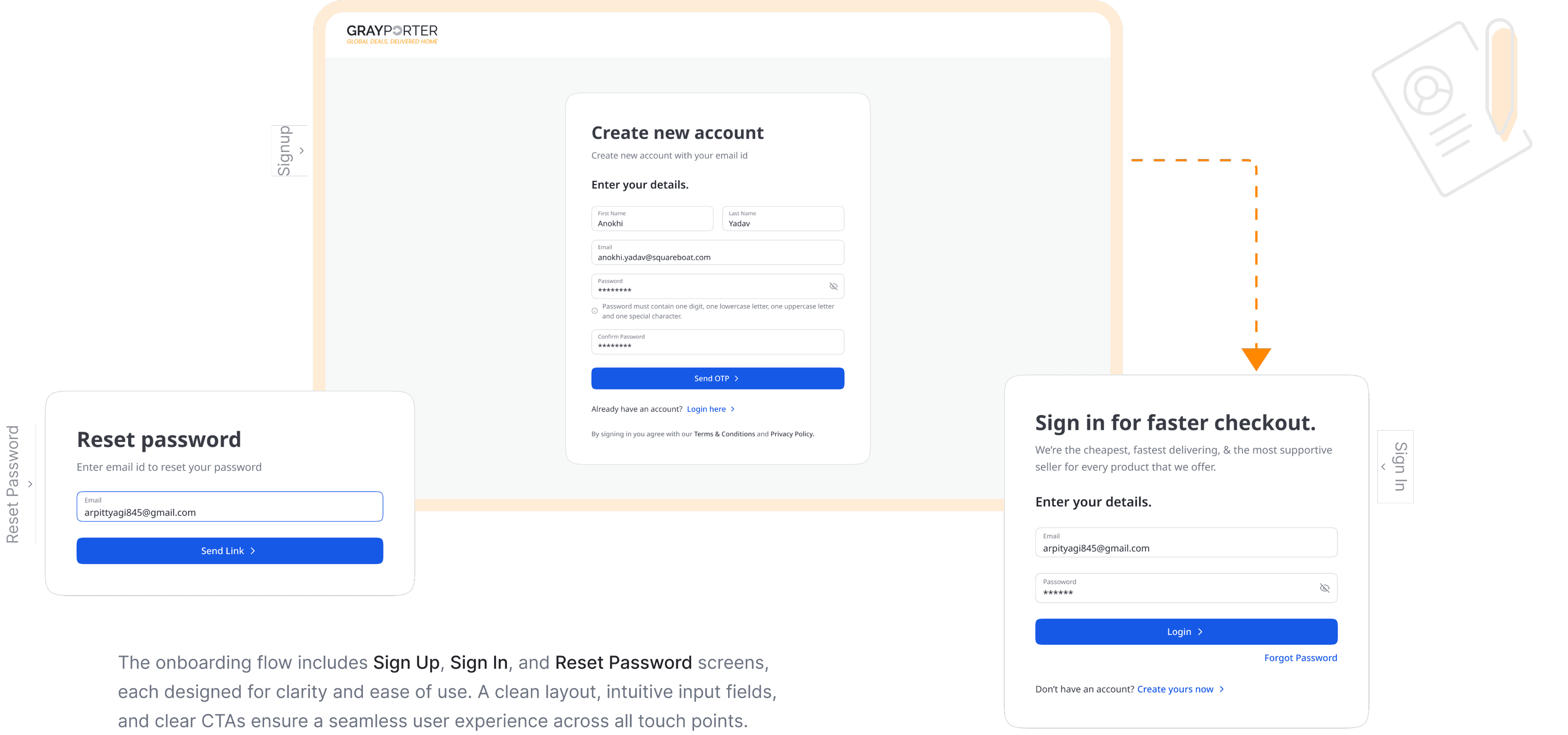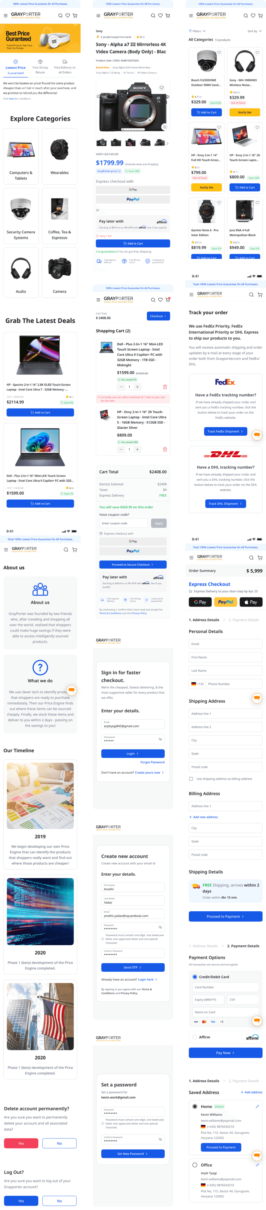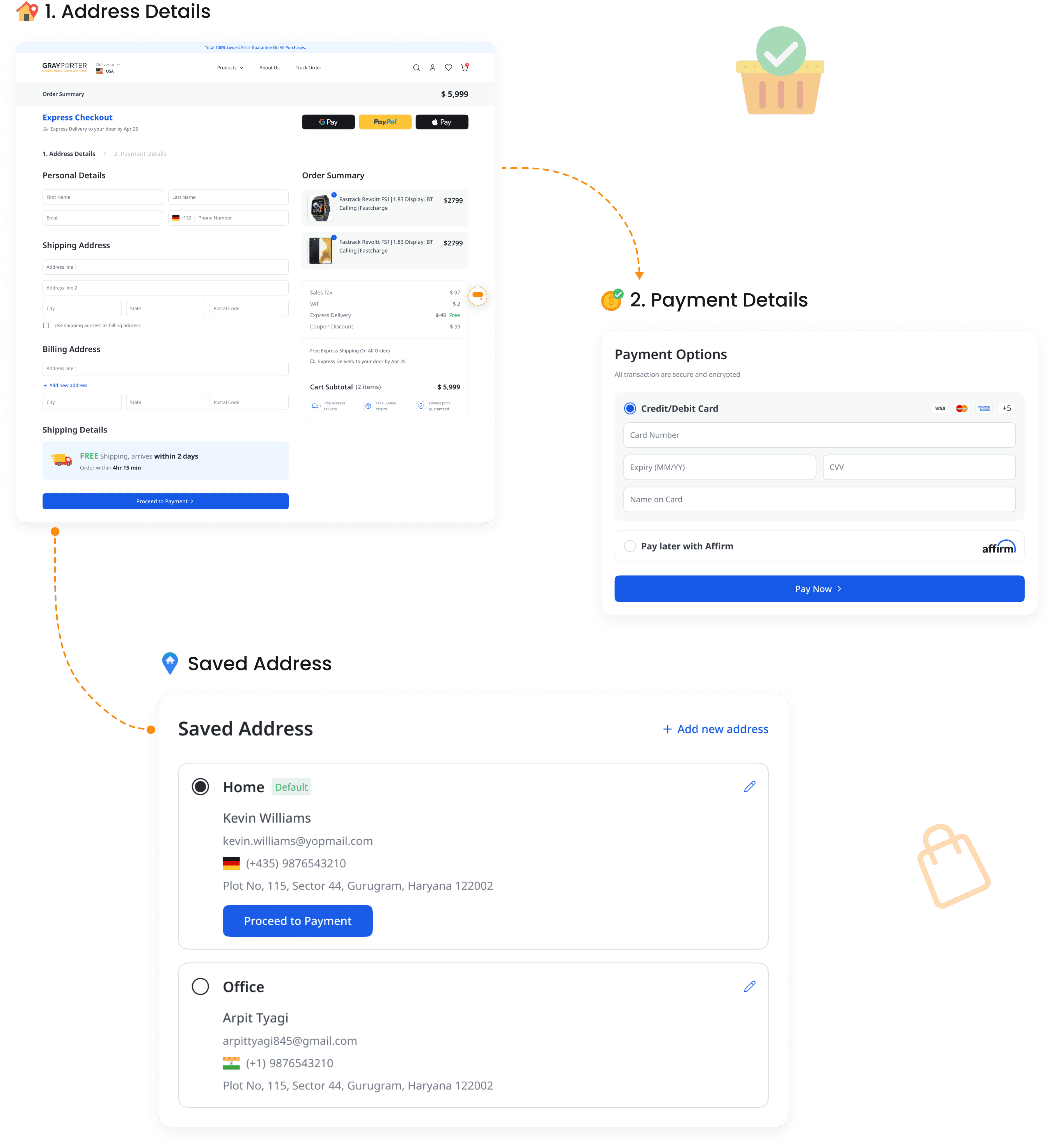The Checkout Page is designed for a smooth and secure purchase experience. It includes address details, saved addresses for quick selection, and adding payment details.