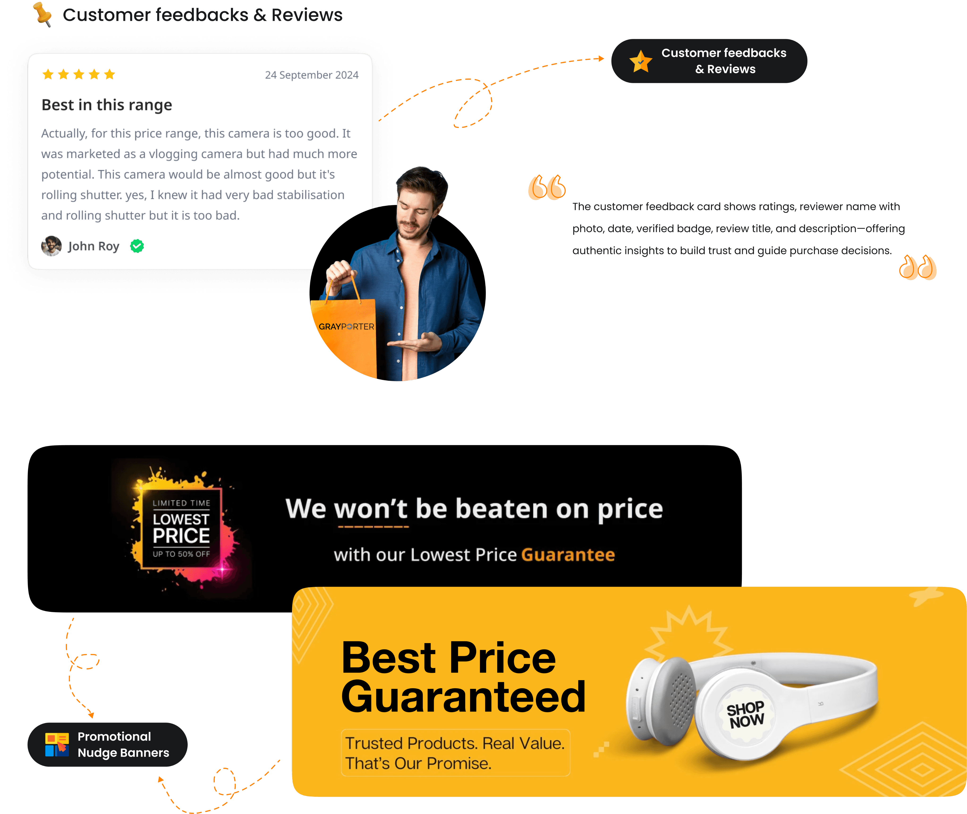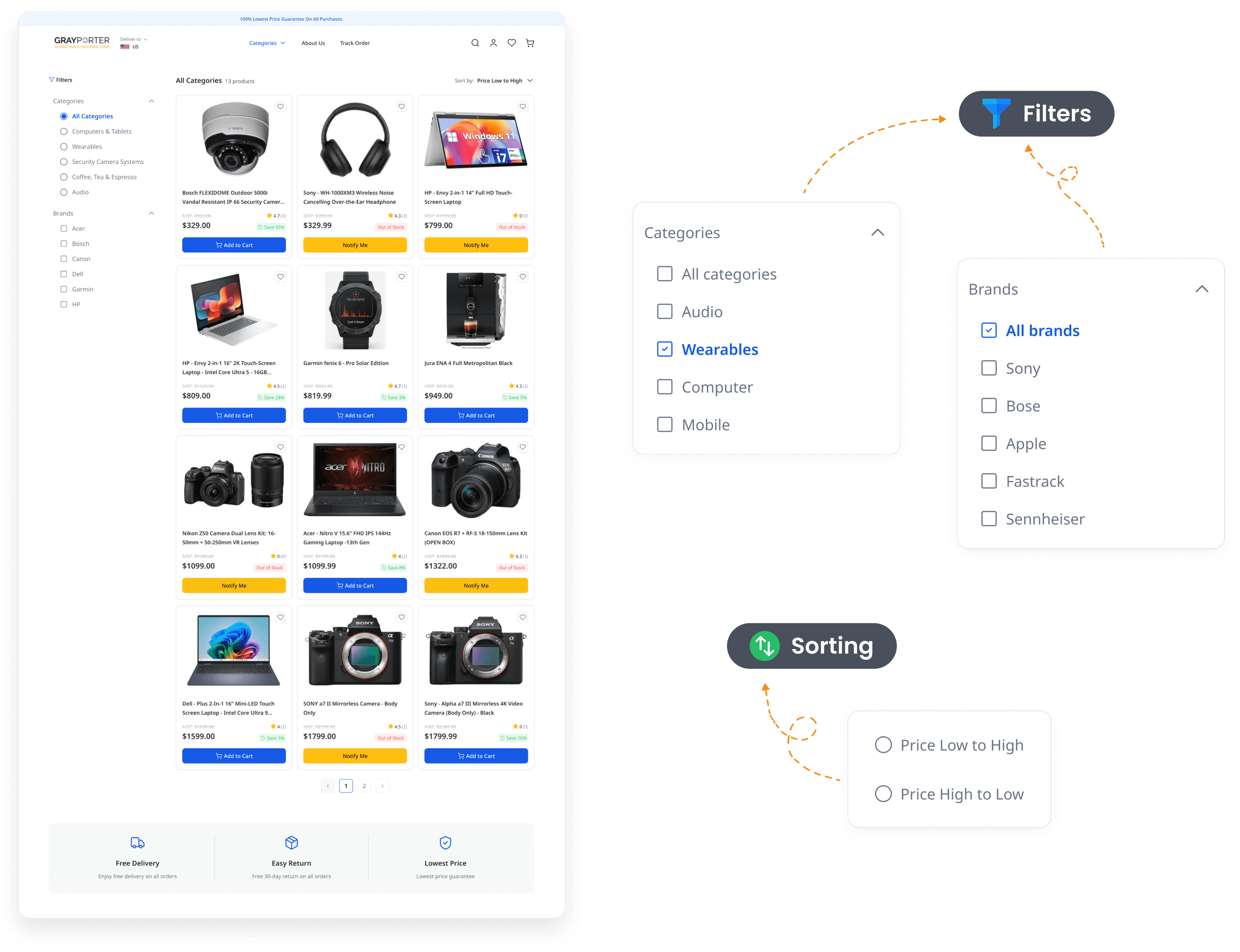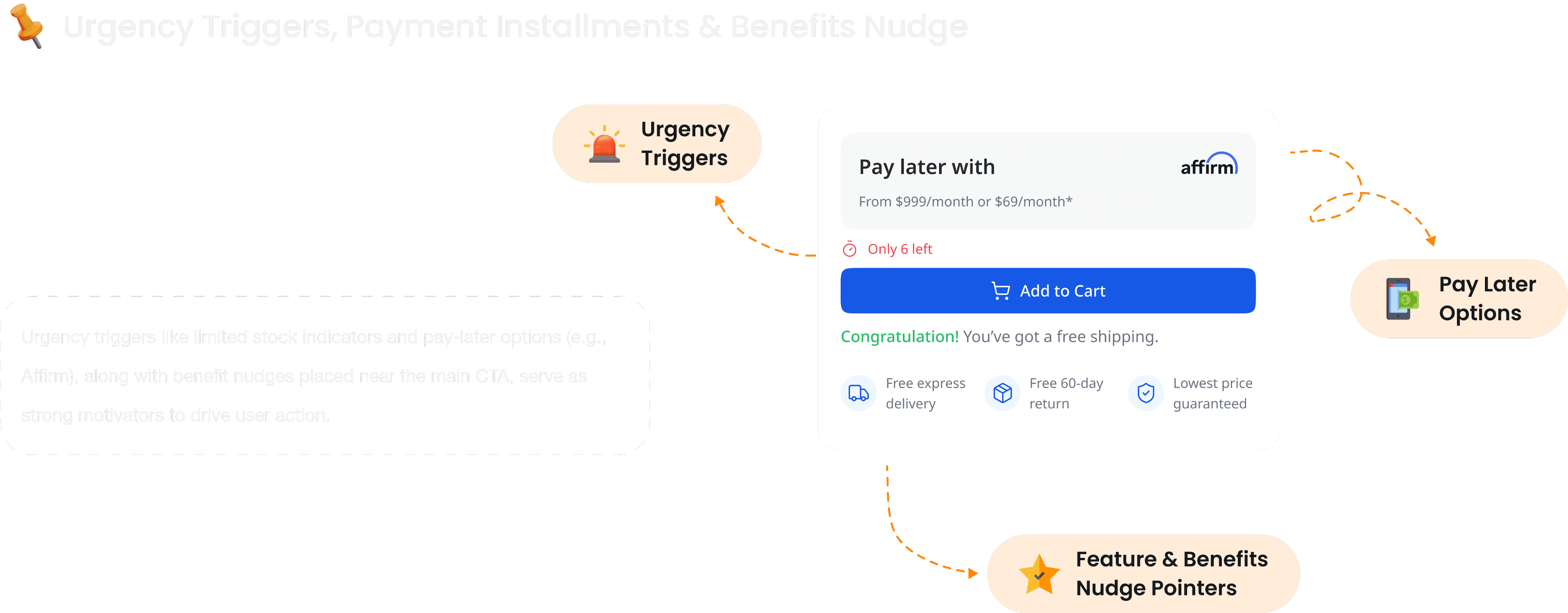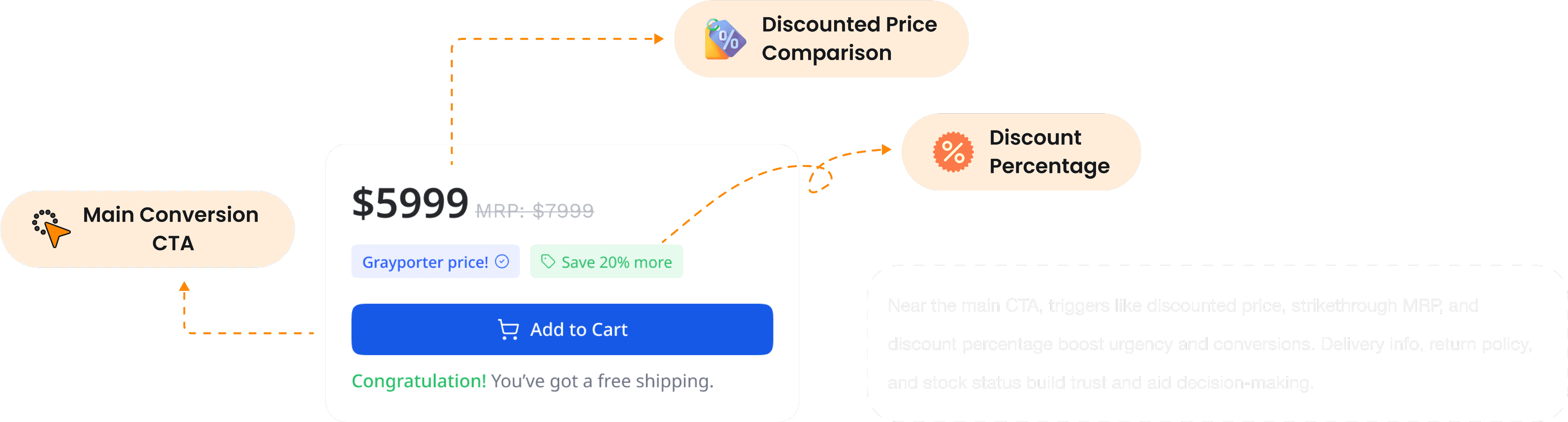 Trust signals: Ratings, warranty, return policy, free delivery badge.