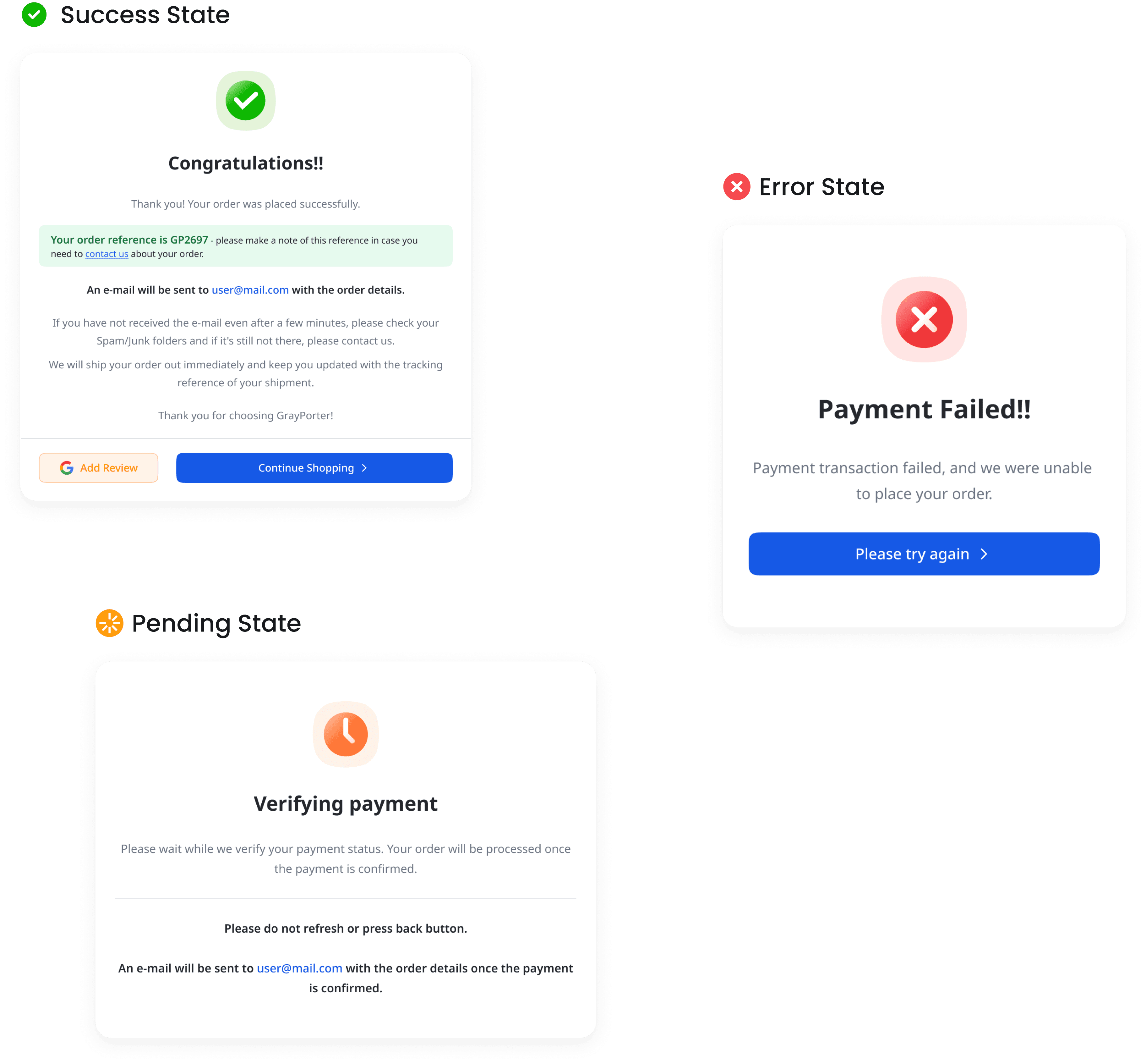 Clear error and success states ensure users are informed at every step. After order confirmation, a detailed success screen displays order summary reinforcing trust and giving users confidence their purchase was successful.