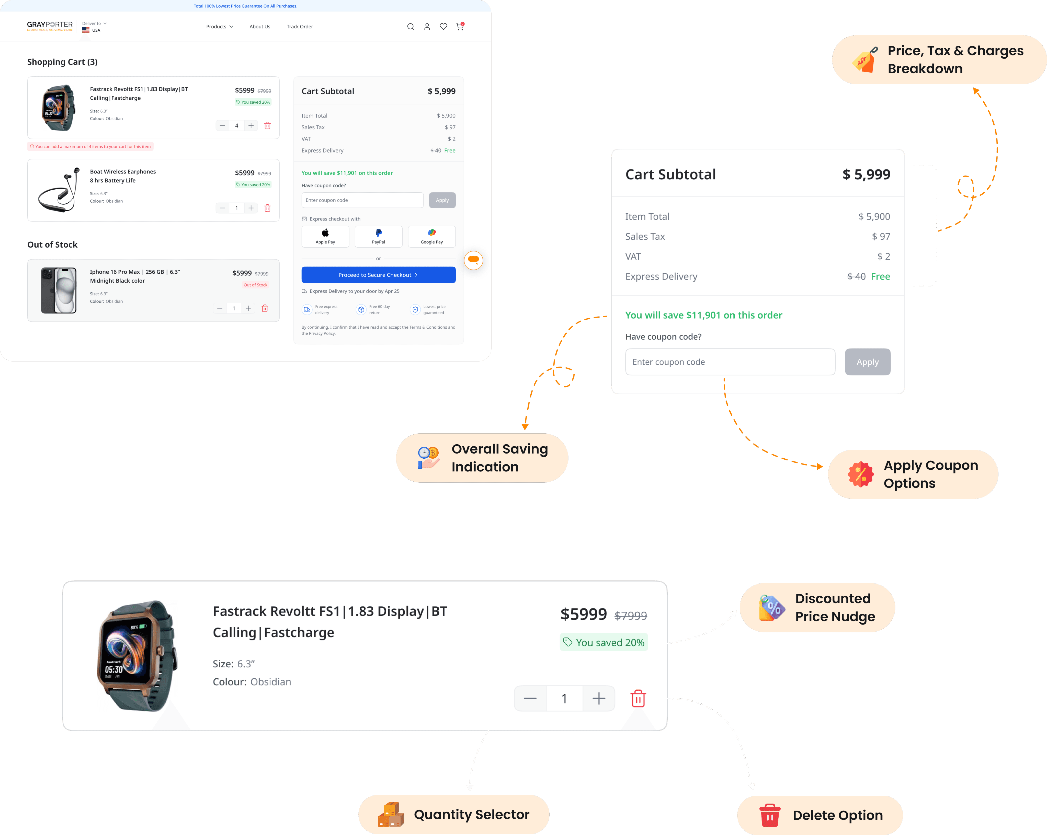 The Shopping Cart page offers a quick overview of selected items with editable quantities and clear pricing. It’s designed for easy updates and a seamless transition to the checkout process.